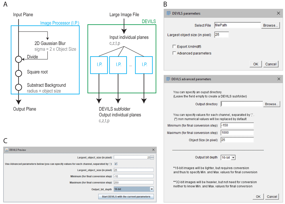 All parameters are entered via a graphical user interface (GUI) as shown in Figure 2B and are recordable as a macro. The advanced parameter options allow the user to specify the output folder, change the output bit-depth of the images (8-, 16- or 32-bit) and specify the minimum and maximum ranges for conversion to an 8-bit or 16-bit image. Such a conversion decreases the size of the output data but requires careful selection of the minimum and maximum values to avoid data clipping artefacts. In the basic mode, a minimum and maximum of -100 and 10000, respectively, are set and the image bit depth is fixed at 16-bit. For rapid testing of the DEVILS operation, a preview mode is available (Figure 2C). It processes a single image and can be used for parameter optimization e.g. to find suitable values for the image conversion.