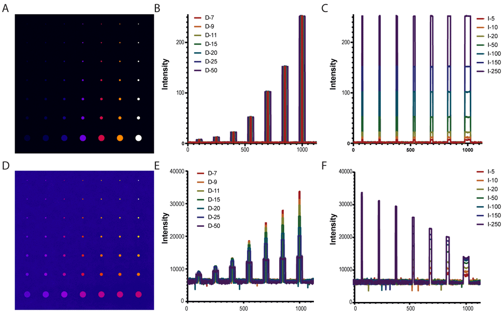The effect of the DEVILS operation is visible in Figure 3D, with the smaller and fainter spots now being visible (top left corner of the image) and the intensity of the larger and brighter spots being compressed. The line profiles in Figure 3E – F reveal that the DEVILS output is scaling with the size and the intensity of the input disk. It becomes obvious that larger disks and brighter disks become dimmer after DEVILS processing. The intensity amplification factor (see Figure S2, Extended data (Guiet et al., 2020a)) is larger for low intensity objects of small size. In the example shown here the ratio of input to output object intensity is around two for the dimmest and smallest object (r = 7, I = 5). It drops to 1.6 for the largest object with the same intensity. It drops more markedly with increasing intensity. It is around one for I = 20 and drops to 0.25 for the smallest disk with the maximum intensity (r = 7, I = 250). The intensity of the largest object (r = 50) is damped by a factor of 0.07. In summary: small, dim objects are becoming brighter, the pixel intensity of large, bright objects is reduced. The maximal amplification difference between the smallest dimmest object and the largest brightest object is 30 in the example shown. This enables the researcher to inspect these objects in one single image. However, it must be stressed that the intensity of the signal can by no means be correlated to the protein, antigen or antibody concentration after the DEVILS algorithm has been applied.