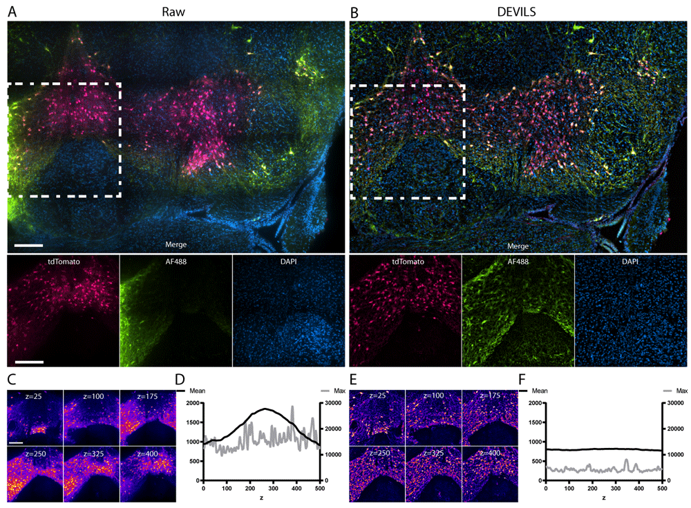 In Figure 4 the DEVILS algorithm was used in order to facilitate the inspection of a 3D multichannel dataset. Dopaminergic neurons in the mouse midbrain expressing the fluorescent protein tdTomato were immunostained with an α-tyrosine hydroxylase (TH) antibody, visualized with an Alexa Fluor 488 secondary antibody (AF488). DAPI was used as a nuclear counterstain. The algorithm was applied to each channel separately. The overlay of the raw images and the outcome of the DEVILS operation are shown in the main panels of Figure 4A and 4B, respectively. Several observations can be made when comparing cropped regions from raw and processed images (dashed square in Figure 4A – B). First, DEVILS processing reveals a lot of hidden detail; this is visible in all channels, but most marked in the AF488 channel. Second, the intensity drop of individual acquisition tiles towards their edges is reduced after DEVILS processing. Third, a final advantage can be seen in the intensity profile plots along the Z-axis of the image stack: DEVILS processing significantly flattens the bell-shaped curve of the mean intensity per slice (Figure 4D and 4F). This enables a more rapid inspection of the 3D-dataset as no intensity adjustments need to be made when moving between Z-planes. In fact, the entire dataset can now be visualized with the same display settings. The utility of DEVILS is furthermore demonstrated in Figure 5 where it was applied to datasets acquired from different species and different microscope setups.