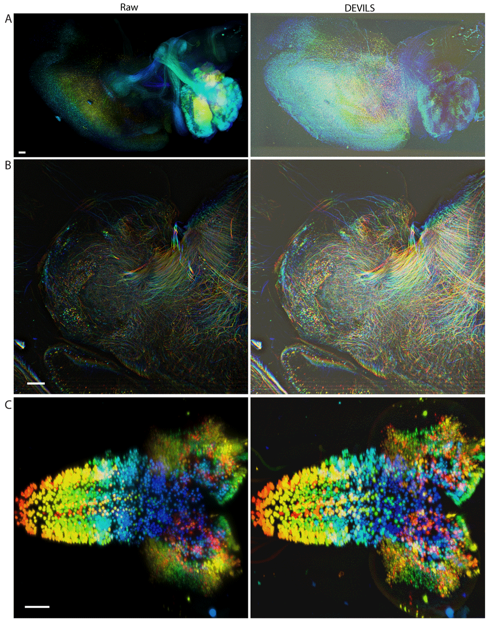 (A) Cleared mouse brain acquired with a mesoSPIM\0.8X. Comparison of raw and DEVILS processed images of a Z-color-coded projection using the “Physics” look-up table (LUT). The auto contrast was set on slice 600. Scale bar: 500 µm. (B) Cleared mouse brain acquired with a mesoSPIM\2.0X. Comparison of raw and DEVILS processed images of a Z-color-coded projection using the “Physics” LUT. The auto contrast was set on slice 600. Scale bar: 500 µm. (C) Drosophila brain acquired with light-sheet fluorescence microscopy (LSFM). Comparison of raw and DEVILS processed images of a Z-color-coded projection using the Physics LUT. The auto contrast was set on slice 380. Scale bar: 50 µm.