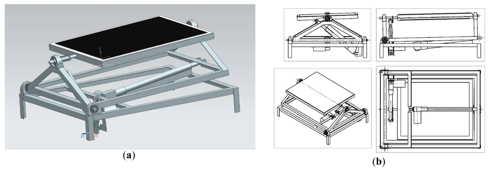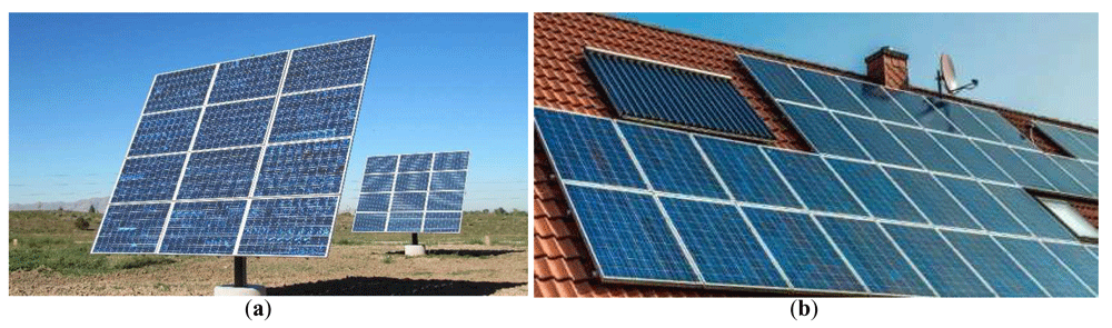 (a) Free standing solar panel, equipped with a solar tracker and actuators, enabling the tracking of sun position throughout the days and seasons19. (b) Roof-mounted solar panel with a fixed mount and no ability to track the sun.