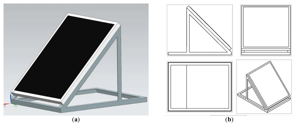 The plan for the study included construction of two test benches after conceptual design phase in SIEMENS NX 12. The first test bench was meant for creating a reference data set for the standard mounted roof solar panel. It was designed with the slope angle of 45° and a set of adjustable feet to give it some room for adjustment of the slope on site. The model and its individual spatial projections were shown of Figure 2.