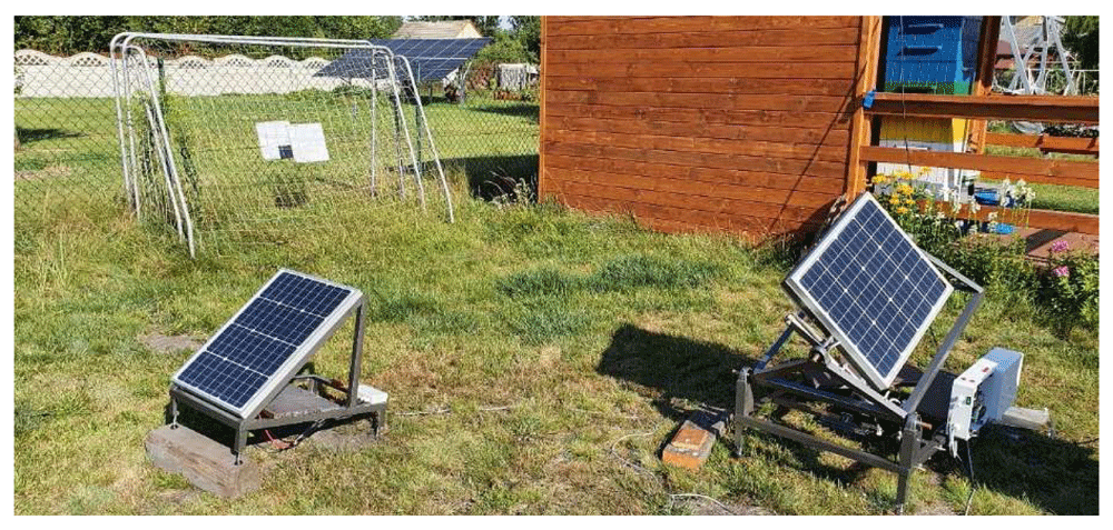 To accommodate the aforementioned system of axis movement with the applied algorithm, a series of angular conversions was prepared, that converted outputted azimuth and zenith angles into angles that were to be achieved by the stand, to properly track the sun position. Solar tracker was set to adjust panel position every 90 seconds. In terms of a proper comparison between results obtained from the reference test bench and the solar tracking test bench, both of them were equipped with identical 50 W monocrystalline solar panels, with a work surface of 540 × 670 mm, capable of outputting 2.78 A of current at 18 V. The same Arduino Uno controller used for the implementation of the solar tracker algorithm was also responsible for registering power outputs of both solar panels at 30 second intervals due to lack of a proper MPPT controller. The power readings were saved on the SD Card memory in form of files that contained consecutive power readings in beforementioned 30 second intervals recorded throughout the day. The outputted power was being drained by two 100 W power resistors, converting all the electrical energy into heat. Each panel had its own power registering loop, coupled with own power resistor. The circuitry involved in the study is completely separated from the measurement loop to avoid any interference from the actuators or the controller. To avoid overflow of memory on the Arduino Uno controller it was unfortunately decided to omit the measurement of power draw from the whole solar tracker circuit during its operation. It is a consideration to upgrade the measuring system in the future experiments, to also include this power draw in the equation. Although the panels are planned to be implemented as a new roof mounted solution, it was very hard to find building owners willing to spare their roof for testing purposes. To mitigate this obstacle, a decision was made to try and consider the possible range of movement, a panel could have, when mounted on a roof. The possible application of the current construction to a building roof would involve rotating the panel by 180° along its base and adjusting the calculation of zenith angle, to include roof inclination in the equation. For the purposes of this experiment, both panels were placed on the ground with adjustable feet as supports. The mechanical part of both test stands was completed around June. The electrical wiring and programming of the Arduino controller was completed in August, just before the tests began. A complete setup placed in its final study destination can be seen on Figure 4.