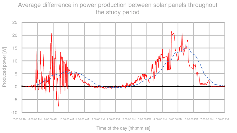 Figure 5 represents an average daily difference in consecutive power output readings between stationary and solar tracking panels based directly on gathered samples from both solar panels throughout the study period. The red line represents an average of measurements taken from the same time of day throughout the study period. Again, due to problems in the first two days of the study, the graph is heavily disturbed in the morning period. The blue dashed line represents a moving average with a window of 120 samples (equal to one hour). Judging by the moving average, it can be noticed that the peak gain of around 5 W/s was achieved between 9 and 10:30. The efficiency gains are diminishing past 11 and there are no visible gains between 12 and 14. Again, past 14, the solar tracking panel starts to gather more energy with a peak gain of around 15 W/s around 17:30. After that, the gains start to quickly diminish again to 0 towards the evening hours.