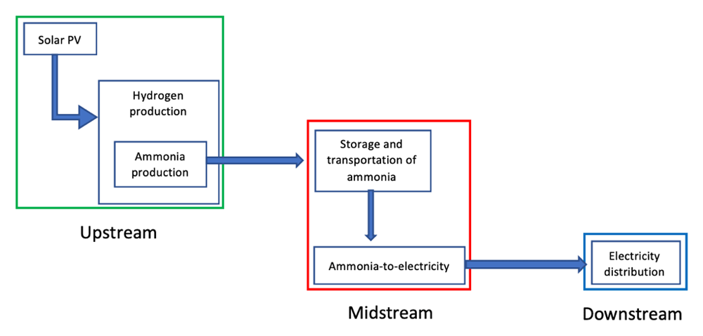 In conclusion, choosing a centralized strategy (as shown in Figure 10) over a decentralized one is preferred and possible, where hydrogen per se would not satisfy technical and financial parameter, hydrogen embedded into ammonia will, even if more detailed studies are required. “Hydrogen through ammonia economy via ammonia for power” [59, p. 96], this will be our SURESC’s midstream model. SURESC’s midstream starts (and upstream ends) with the storage of green ammonia, leaving its production to the upstream, followed by transportation to the centralized power station network. Next, we need to step-up once again the energy streamline into upstream and analyze how green ammonia can be produced efficiently and above all, carbon-free. Once again, the use of non-disruptive technologies, or integrable technologies would be highly recommended.