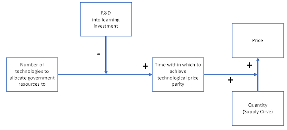 Tc are the technical changes throughout time, representing technology advancement. As previously seen in learning curves, time to achieve technological price parity is directly related to the number of technologies n to allocate limited resources to. This means that by diminishing n, we increase technological advancement of maturing technologies and therefore we diminish the time between each technological change, resulting into an increase of Tc. In conclusion, n is negatively related to Tc, and Tc acts as a moderator to the P(Qs) function.