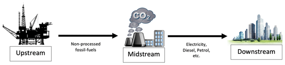 • Downstream, which is the final sector of the energy streams, referring to all processes associated with the end usage of this commodity. In the oil sector, downstream would include all processes to produce diesel, gasoline, synthetic rubbers, and many more day-to-day products. In the renewable industry, downstream processes include hydrogen to electricity transformation and its distribution, electricity distribution into homes, industries and vehicles, and biofuels into usable fuels and its distribution.