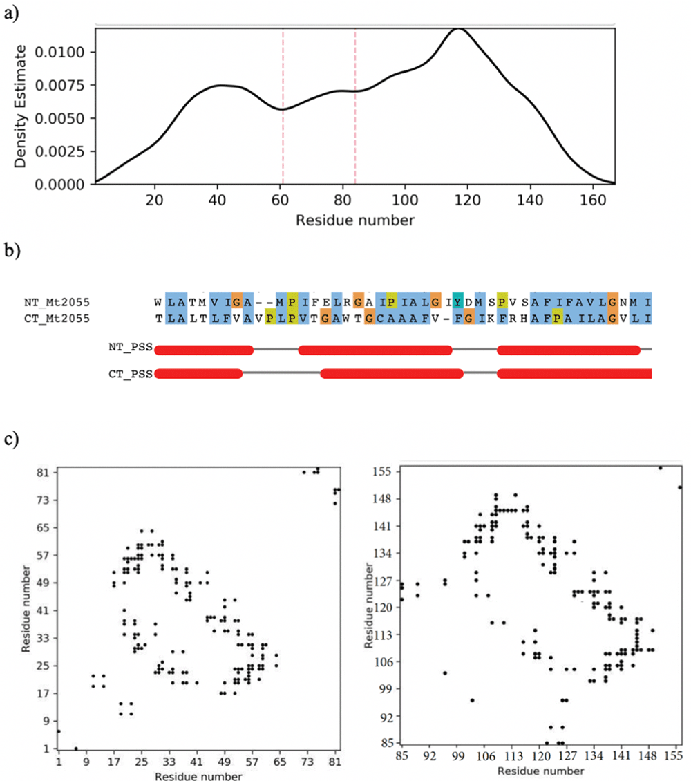 (a) Contact density profile constructed by ConKit (Simkovic et al., 2017b) utilising DeepMetaPSICOV contact prediction. Solid black line represents contact density and dotted red lines mark density minima corresponding to possible domain boundaries. (b) HHalign alignments for the N-terminal and C-terminal Mt2055 halves, formatted using Jalview (Waterhouse et al., 2009) and coloured according to the ClustalX scheme. Red bars represent helical secondary structure. (c) Maps of predicted contacts generated by DeepMetaPSICOV and plotted using ConKit; left is N-terminal half (residues 1-84) and right is C-terminal half (residues 85-168). Black points represent predicted intramolecular contacts.