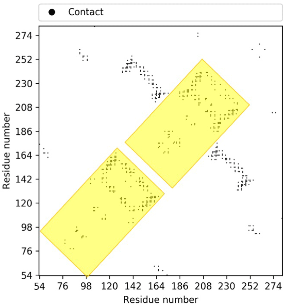 The DeepMetapsicov v1.0 server (Kandathil et al., 2019) was used to generate contact predictions with ConKit v0.12 (Simkovic et al., 2017b) utilised to visualise the contact maps. ConPlot (RRID:SCR_019216) was used to overlay additional prediction data (Sánchez Rodríguez et al., unpublished work).