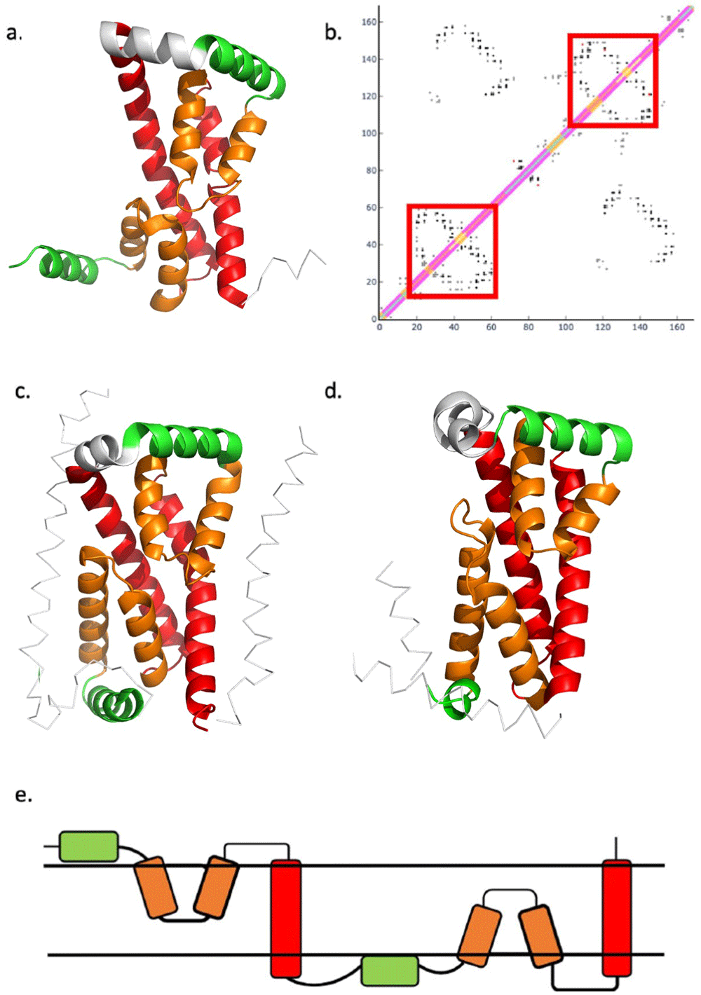 The models (Figure 3) contained interesting features: two inversely symmetrical repeated units each possessing an amphipathic helix (green) and a re-entrant loop (orange) packed with a TM helix (red).