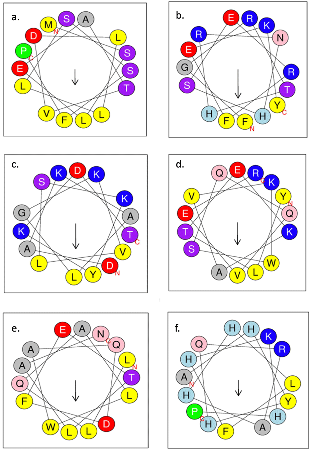 Hydrophobic residues are shown in yellow, serine and threonine in purple, basic residues in dark blue, acidic residues in red, asparagine and glutamine in pink, alanine and glycine in grey, histidine in light blue and proline in green circles. Arrows represent direction and magnitude of the hydrophobic moment and residue marked with ‘N’ is the N-terminal end of the putative amphipathic helix with the residue marked ‘C’ being the C-terminal end. (a) Mt2055 putative amphipathic helix 1 (hydrophobic moment of 0.298). (b) Mt2055 putative amphipathic helix 2 (hydrophobic moment of 0.546). (c) Tmem41b putative amphipathic helix 1 (hydrophobic moment of 0.471). (d) Tmem41b putative amphipathic helix 2 (hydrophobic moment of 0.420). (e). Yqja putative amphipathic helix 1 (hydrophobic moment of 0.295). (f) Yqja putative amphipathic helix 2 (hydrophobic moment of 0.396).