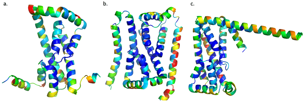 Mapping conservation onto the models, using the Consurf server, indicates that the re-entrant loops are highly conserved and therefore likely to be functionally and/or structurally important (Figure 5).