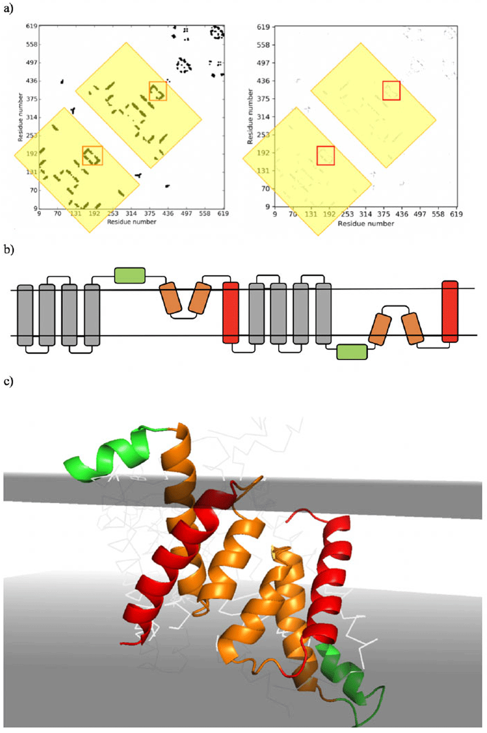 (a) Left - Predicted Contact map with repeating units highlighted in yellow boxes, contact map signature of re-entrant loop packed with TM helix in red boxes.; Right - The Experimental Contact map obtained from the PDB structure with repeating units highlighted in yellow boxes, contact map signature of re-entrant loop packed with TM helix in red boxes. (b) Actual 3orgA topology; grey: TM Helices that are additional to the core; red: TM helices contributing to the formation of the core; orange; re-entrant loops contributing to the formation of the core; green: amphipathic helices contributing to the formation of the core. (c) The 2-fold pseudo symmetry of the amphipathic/re-entrant loop/TM helix core inverted repeat structure of 3orgA with membrane positions shown as grey planes obtained from PDBTM.