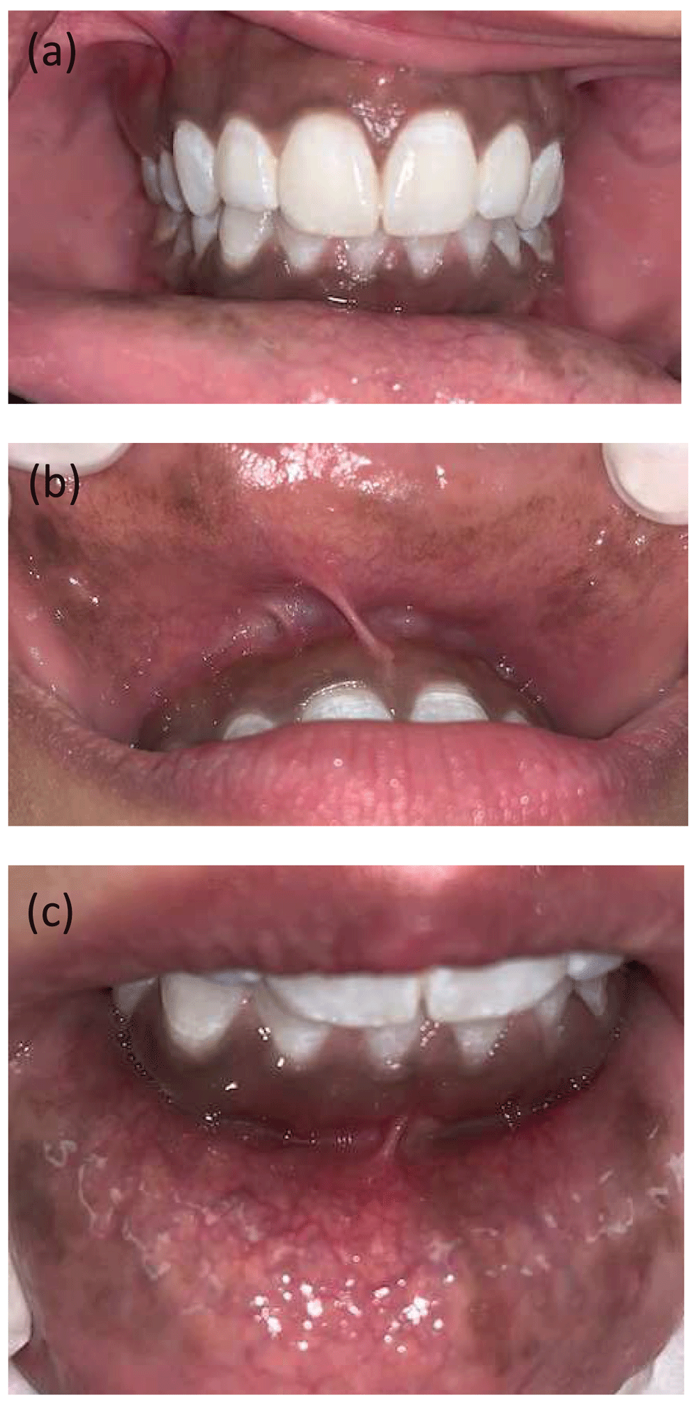 Macular brown pigmentation with irregular margins involving (a) upper and lower attached and free gingivae; (b) upper labial mucosa; (c) lower labial mucosa.