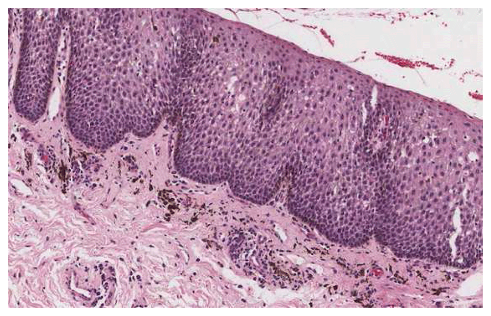 Microphotograph of hematoxylin and eosins stained tissue shows the parakeratinized, hyperplastic, stratified squamous epithelium with acanthosis, and long rete ridges. Many benign dendritic melanocytes with dendritic processes can be seen distributed in the epithelium, as well as melanin deposits in the lamina propria.