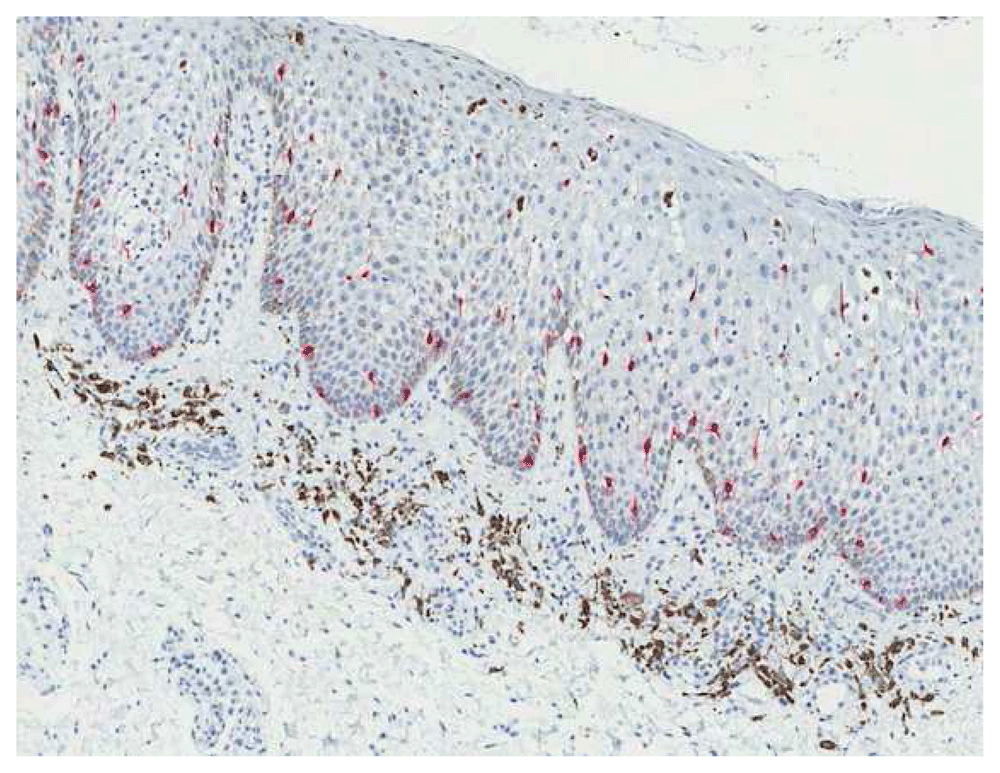 The clinical presentation and the widespread nature of the lesion were worrisome to the clinician; therefore an incisional biopsy was performed. The goals and expectations of the procedure were discussed with the patient as well as the potential risks for surgical and post-surgical complications such as bleeding, swelling, discomfort, infection and scarring. Written informed consent was obtained from the patient. After applying 1.8 mL of the anesthetic solution (lidocaine HCL 2% and epinephrine 1:100,000) via intraoral injection to the gingival area of tooth No. 33, a 3 mm section of gingival tissue was removed at the apical area of tooth No. 33, at the darkest pigmented spot of the lesion and a bit away from the esthetic zone. The incised tissue was blackish-brown in colour and measured 0.3 × 0.2 × 0.1 cm. The gross specimen was fixed in 10% neutral buffered formalin and then submitted as one piece in one cassette for histopathology examination. The microscopic analysis of the hematoxylin and eosin (H&E) stained sections showed a hyperorthokeratinized, hyperplastic, stratified squamous epithelium revealing acanthosis, and long rete ridges. Many benign dendritic melanocytes with pigment-laden dendritic processes were distributed in the epithelium. In addition, melanin pigmentation of basal cell layer was noted with evidence of melanin deposits in the lamina propria (Figure 2). A microphotograph of Melan-A stained tissue shows melanotic hyperplasia in the epithelium (Figure 3).