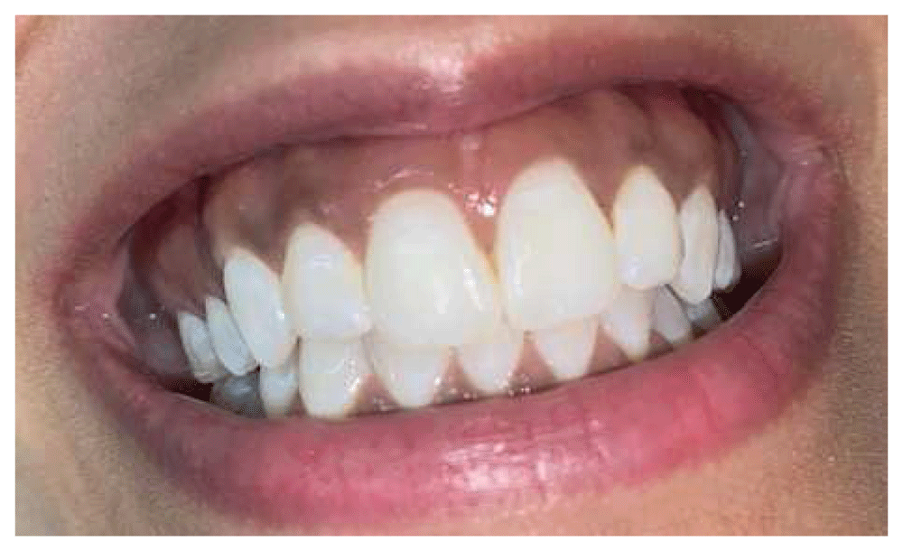 The patient of this case report was a 21-year-old female, Saudi Arabian college student. She was referred by her dentist in July 2018 to an oral medicine specialist for evaluation of a three-month-history of remarkable intraoral, diffuse hyperpigmentation of the upper and lower gingivae and labial mucosae. She reported that the hyperpigmentation appeared suddenly and had rapidly increased in size. The patient reported using teeth whitening strips for six weeks before the intraoral pigmentation happened. Her past medical history revealed hypothyroidism for three years for which she had been taking 100 mcg/day of levothyroxine sodium. She was not on any other mediation. She was not aware of any relevant family history of extensive brown oral pigmentation. She reported no history of mental health disorders and denied the use of tobacco products. The patient was referred to an endocrinologist to rule out systemic diseases such as Addison’s disease. Accordingly, a blood test was carried out and the results were all within normal limits; red blood cell count of 4.99 × 106/μL, platelet count of 259× 103 /μL, hemoglobin count of 13.3 g/dL, white blood cell count of 8.88 × 103/μL, lymphocytes 33.6%, segmented neutrophil 54.6%, ferritin 31.11 ng/mL, iron 14.6 umol/L, FT4 17.67 ng/dL, TSH 0.079 mIU/L, Vitamin D 65 ng/mL and cortisol 184.9 nmol/L. A physical examination revealed no skin pigmentation and an extraoral examination showed no significant findings. An intraoral examination showed asymptomatic, diffuse, smooth, macular blackish-brown pigmentation with irregular margins on both the upper and lower attached and free gingivae, and upper and lower labial mucosae (Figures 1a–1c).