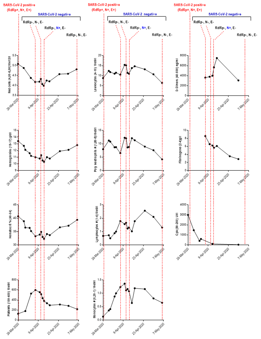 RdRp: RNA-dependent RNA polymerases; N: envelope protein N; S: Spike protein; CpK: creatine phosphokinase; SARS-CoV-2: severe acute respiratory syndrome coronavirus-2; Mar: March; Apr: April; #: Total count. The values between parentheses ‘()’ in the ordinate axis correspond to the reference range values.