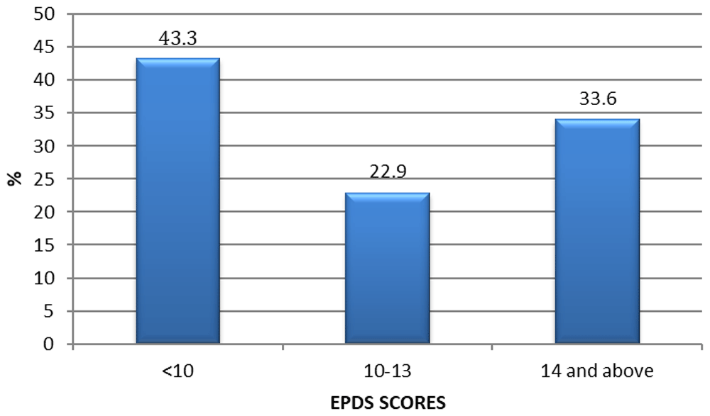 Quantitative analysis. The filled questionnaires were checked for completeness, errors, and discrepancies; this was followed by data entry, cleaning, and analysis using SPSS version 22. Descriptive statistics such as percentage means and standard deviation were used to summarize the socio-demographic data. An EPDS score of >13 pointed the likelihood of the presence of clinical depressive illness. Independent variables were categorized to analyzed, the association between independent and outcome variable, using a bivariate analysis odds ratio (OR) with 95% confidence interval (CI). Those variables that were associated with p<0.001 in the bivariate analysis were entered into multivariate analysis. Variables with p<0.05 in the multivariate analysis were considered to be significant.