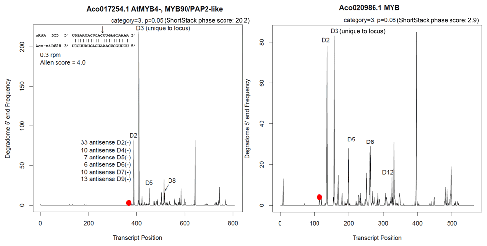 Concatenated sRNA libraries were used as pseudo-degradome on grounds both sliced mRNAs and amplified diced dsRNAs are manifest in sRNA libraries7. Slicing is at nt10 from 5' end of miR828 (arrow, inset; same target sequence for Aco020986.1 at mRNA nt 115). Y axis is numbers of degradome reads in sRNA libraries mapped to cDNAs; red dot is the documented miR828 sliced sRNA species that sets the register for 3’ phasiRNA production.