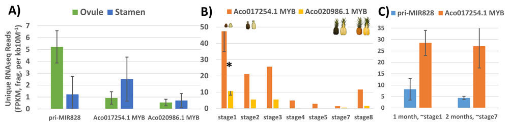 A) Inverse relationship of pri-MIR828 (high) to target MYB Aco017254.1 (low) anthocyanin effector expressions in F153 ovules. Error bars are s.e.m., n=3 biological replicates. B) Down regulation of miR828-targeted MYB anthocyanin effectors during MD2 yellow-fleshed fruit development (n=1 per stage). Asterisk (*) denotes stage 1 significantly different than stages 2-8, p = 0.02 (Student’s two-sided t-test, equal variance assumed). Stage 1 error bars show the 95% confidence interval for significance. C) Apparent maintenance of positive anthocyanin effector MYB Aco017254.1 expression at “ripe” two-month stage of CB5 red-fleshed fruit development, concordant with trend of lower pri-MIR828 expression. Error bars are s.e.m., n=5 biological replicates.