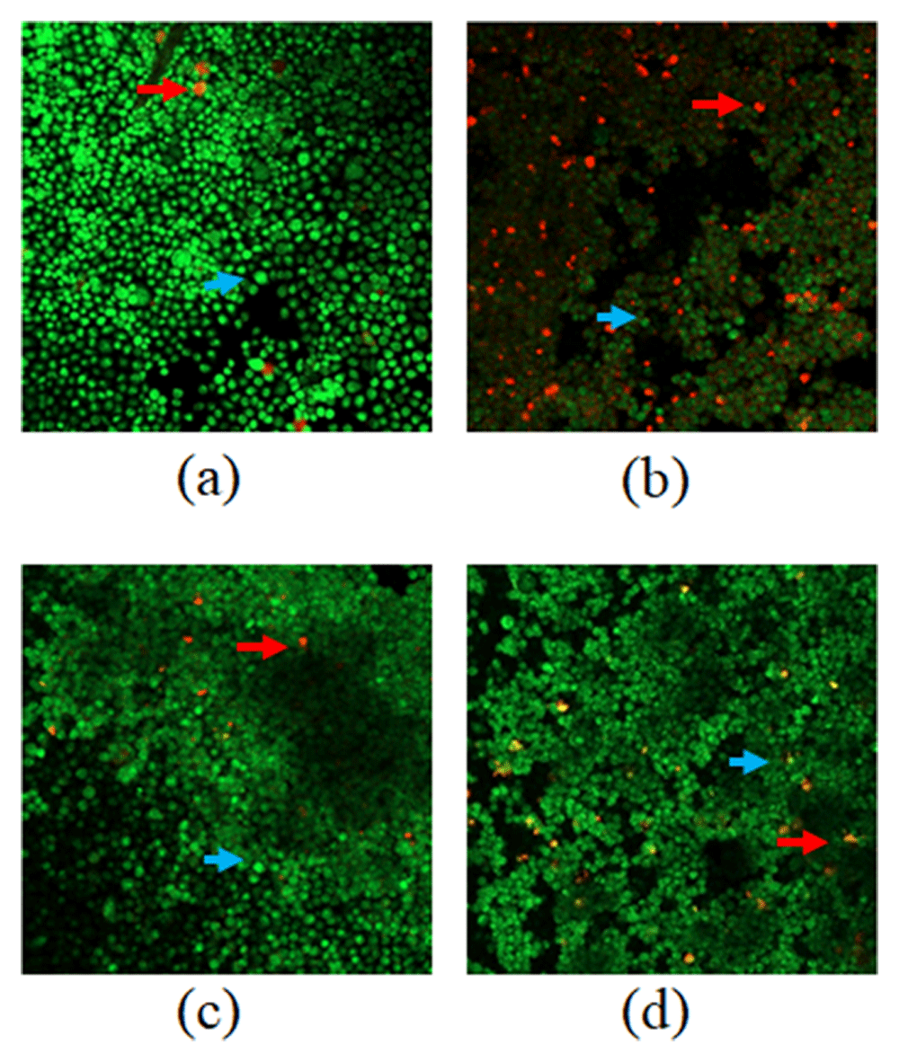 (a) Control cell; (b) PAL 1/5 IC50; (c) PAA1/5IC50; and (d) 5-Fu1/5 IC50.