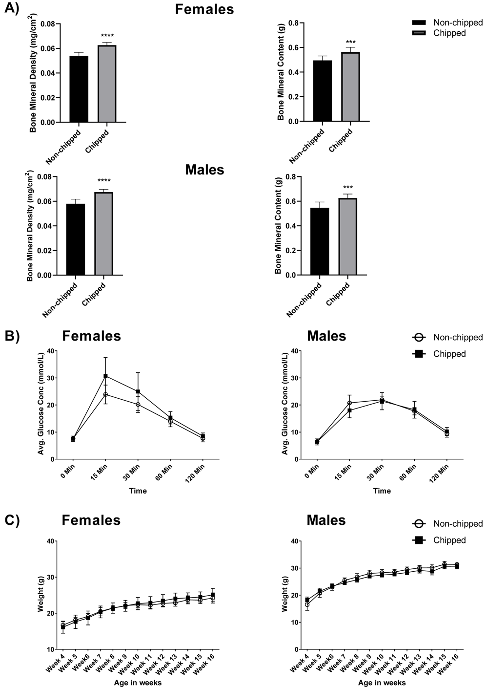 Metabolism. There was no significant difference between the weight curve data of chipped mice compared to unchipped mice over the 12-week testing period10. Figure 1C represents the mean body weight±sem of each group compared every week starting at four weeks of age (16.71±0.29 non-chipped vs 16.13±0.46 chipped females; 16.5±0.63 non-chipped vs 18.22±0.29 chipped males), until the end of the study at 16 weeks (24.22±0.27 non-chipped vs 25.1±0.5 chipped for females; 31.37±0.19 non-chipped vs 30.7±0.41 chipped males). DEXA body composition measurements, represented in Figure 1A, showed significant differences between the two groups, when analyzing bone mineral density (p<0.0001; mean±sem= 0.054±0.001 non-chipped vs 0.063±0.001 chipped females; 0.057±0.001 non-chipped vs 0.067±0.001 chipped males) and bone mineral content (p<0.001; 0.49±0.01 non-chipped vs 0.56±0.01 chipped females; 0.55±0.01 non-chipped vs 0.63±0.01 chipped males) in both males and females. This can be attributed to the texture of the microchip, which would behave similarly to bone when imaged using DEXA. The results from the IPGTT, represented in Figure 1B, showed an increase in mean blood glucose concentration at the 15-minute time point for microchipped females (30.73±1.87) versus unchipped females (23.88±1.04), but this was not statistically significant. No evidence of altered glucose metabolism was seen in chipped males (17.99±0.87) versus unchipped males (20.76±0.86) for the 15-minute time point.