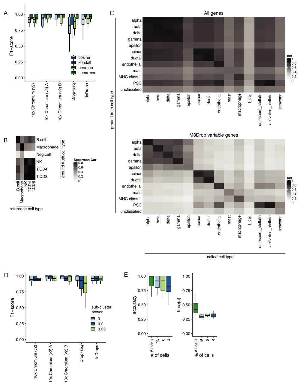 Variable gene selection. As the core function of clustifyr is ranked correlation, feature selection to focus on highly variable genes is critical. In Figure 2C, we compare correlation coefficients using all detected genes (>10,000) vs feature selection by the package M3Drop. A basic level of feature selection, e.g. M3Drop, Seurat VST (default takes top 2,000), or simply 1,000 genes with highest variance in the reference data, is sufficient to classify the pancreatic cells. In the case of other cell type mixtures, especially ones without complete knowledge of the expected cell types, clustering and feature selection will be of greater importance. clustifyr does not provide novel clustering or feature selection methods on its own, but instead is built to maintain flexibility to incorporate methods from other, and future, packages. We view these questions as a fast-moving fields18,19, and hope to benefit from new advances, while keeping the general clustifyr framework intact.