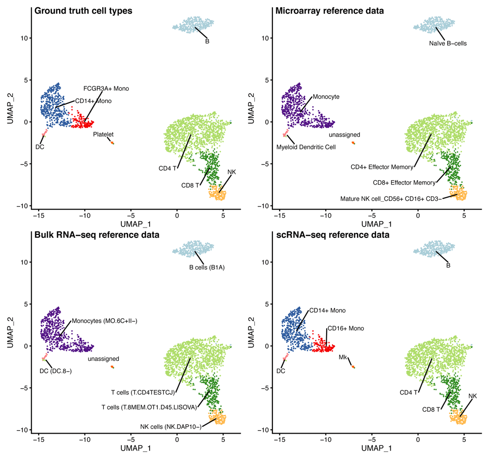 UMAP projections showing the ground truth cell types, or cell types called by clustifyr using different data sources (microarray or bulk RNA-seq data from purified cell types, or scRNA-seq data).
