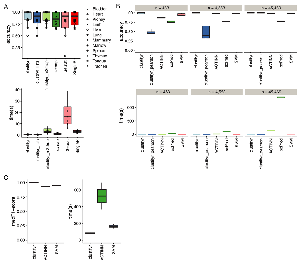 For scalability benchmarking, we adapted scRNAseq_Benchmark subsampling for the Tabula Muris dataset. Once again, clustifyr is accurate and efficient, compared to other developed methods (Figure 4B). We also reached similarly satisfactory results in scRNA-seq brain transcriptome data from mouse and human samples, as detailed by scRNAseq_Benchmark pipeline using data from the Allen Institute Brain Atlas13 (Figure 4C).