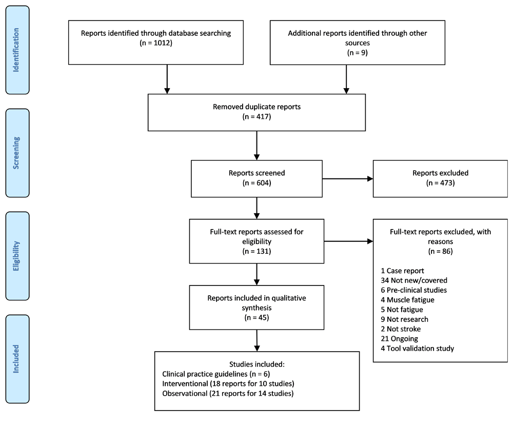 The variety of the interventions tested in studies and trials underlines the complexity of PSF and is an indication to researchers that probably the most effective interventions need to target multiple aspects of fatigue. While current reporting practice of interventions in RCTs included in our review is of concern (none followed TIDieR and two followed CONSORT), future studies should consider following reporting guidelines such as CONSORT and TIDieR for interventional studies, STROBE for observational studies, and RIGHT105, AGREE106, or CheckUP107 for clinical practice guidelines.