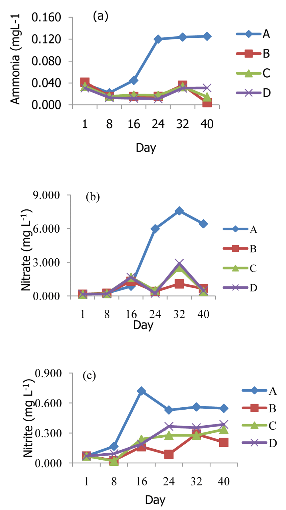 In the control treatment, the concentrations of ammonia, nitrite, and nitrate increased gradually with increasing experimental time. However, in the starter treatments, the ammonia concentration dropped during the first week of the experiment (day 8), became stagnant during the second and third weeks (day 16 to day 24), and increased again at day 32 of the experiment. However, the ammonia concentration decreased sharply at day 40 (Figure 1a). The nitrite concentration also decreased during the first week but increased slightly at day 16 and increased gradually until day 40 in treatments C (tapioca) and D (sucrose). By contrast, the nitrite concentration decreased at day 24, increased at day 32, and decreased at day 40 (Figure 1b). The nitrate concentration was relatively stagnant from day 1 to day 8. The nitrate concentration fluctuated during the experiment (Figure 1c). In general, the molasses starter (treatment B) yielded slightly better results than the other starters, but no significant different was found between the treatments except the control. The data of the growth performance of the tilapia fish O. niloticus has been published separately29.