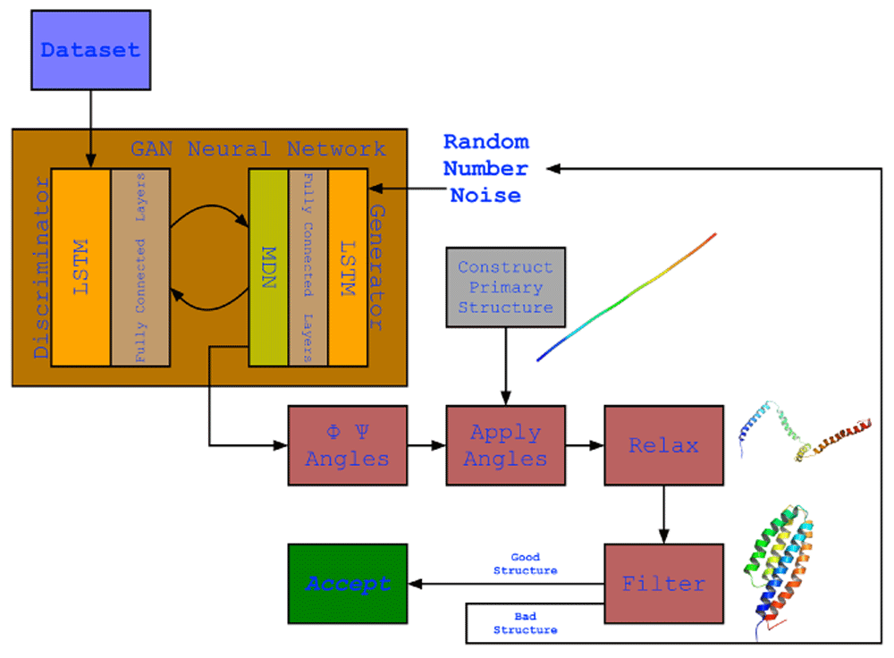 Generative Adversarial Network, De novo Protein Design, Machine Learning, Neural Network, Deep Learning, Helical Proteins, Protein backbone, Long Short-Term Memory