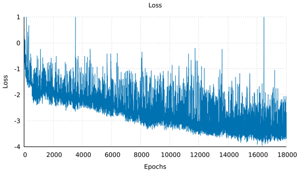 The mean loss of the whole network over epoch, for 18,000 epochs, showing a general downward trend. This indicates that in subsequent epochs the G network gets better at generating structures that the D network correctly classifies as real logical structures.