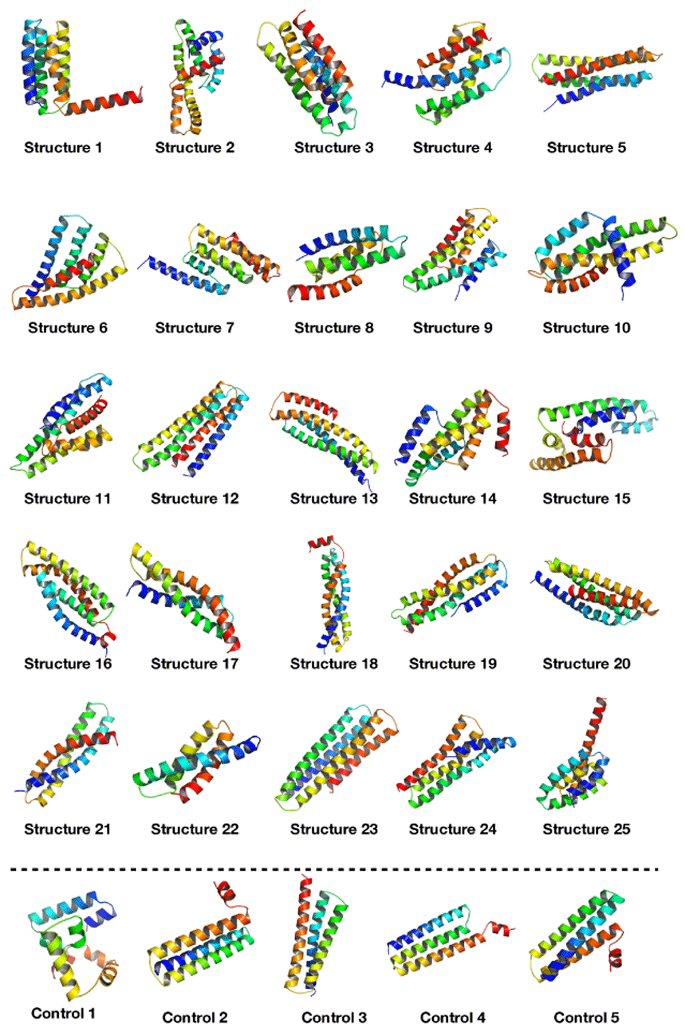 This figure shows all 25 structures that were generated using the neural network displayed using PyMOL24. It can be seen that all structures have compact helical structures of variable topologies. The 5 control structures at the bottom were generated using the protocol from the 5 paper showing better helices but similar compactness.