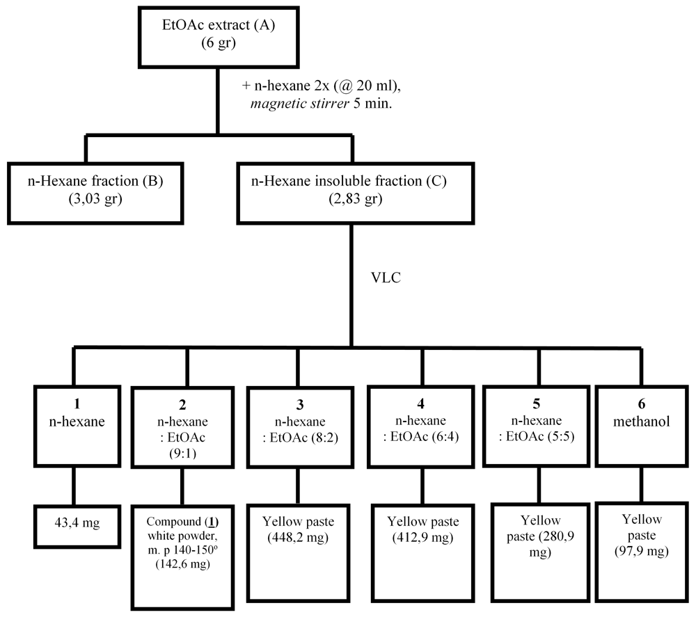 The peel was separated from the fruit, dried in oven 50°C for 24 hours and powdered using a blender. Powdered L. domesticum fruit peel (200 gr) was macerated with ethyl acetate (EtOAc; 2 L) overnight. This solution was filtrated (0,45μm) and the filtrate was evaporated to dryness with a rotary evaporator set at 50°C, to give dried EtOAc extract (A, 50.13 g). In order to separate the extract into non-polar and polar fractions, 6 gr of extract A was diluted 5 times using n-hexane (20 mL) to give soluble n-hexane fraction B (supernatant; 3.03 g) and insoluble n-hexane fraction C (residue; 2.83 g).