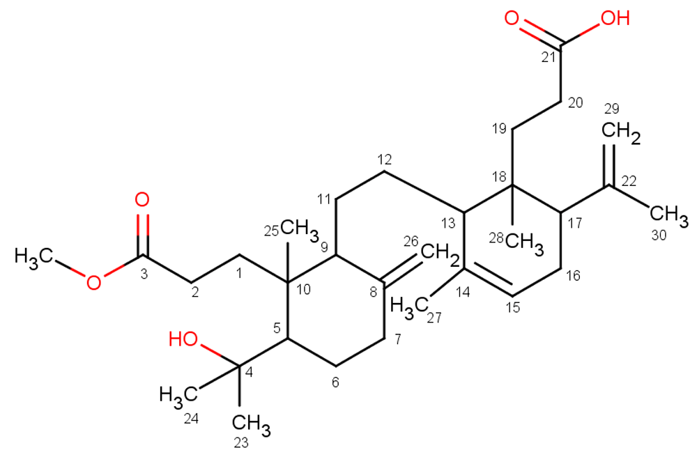 The infrared spectroscopy (KBr) spectrum of 1 showed a broad band at 3400–2800 cm-1, which indicated the presence of –OH group, specifically –COOH due to intermolecular bonding. This data is supported by the appearance of –C=O at 1712 cm-1. Compound 1 displayed UV absorption at 236,5 nm. The 13C-NMR spectrum (500 MHz, CDCl3) of compound 1 showed 30 carbons (Table 1). There were two down field carbon signals (δ, 147.6 and 148.1 ppm) identified as C=O signal carbons. Two characteristic terminals =CH2 signals (δ, 107.4 and 114.2 ppm) were observed, and this identity was confirmed by 2D (Het-Cor) NMR technique. Based on 13C-NMR and 1H-NMR data, compound 1 (Figure 2) was identified as Lamesticumin A (C31H50O5, m/z, 502) which was previously isolated from L. domesticum twigs5.