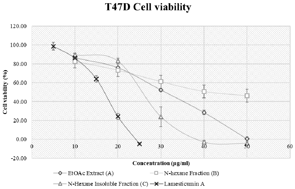 - Cell viability and IC50 values of extract A, fractions B and C, compound 1 and doxorubicin in T47D cell line.