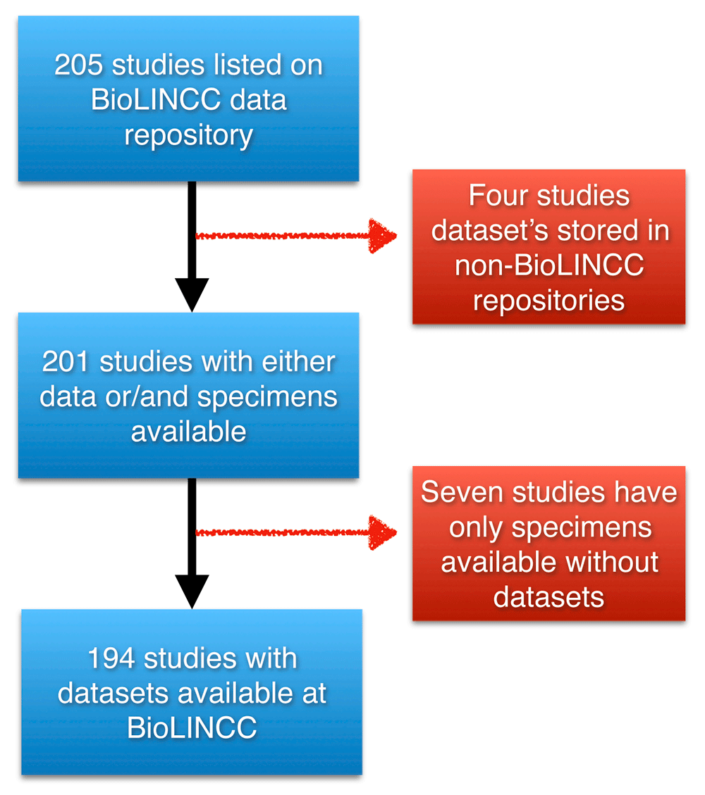 There are a total of 205 studies listed on BioLINCC data repository, where four studies have their data stored in other repositories, and seven studies have only specimens available at the BioLINCC institution available upon request, but no datasets associated with them. We only included datasets stored in BioLINCC repository and can be accessed through their portal, which comprises 194 dataset. (Figure 1).