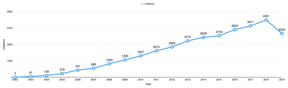 The 987 open data publications received a total of 34,181 citations from 27,904 published articles up to 1st October 2019. The average citation per item for the publications using BioLINCC data was 34.63. The total number of citations received by publications using BioLINCC data per year has increased from only 2 citations in 2002, to a peak of 2361 citations in 2018 (Figure 3).