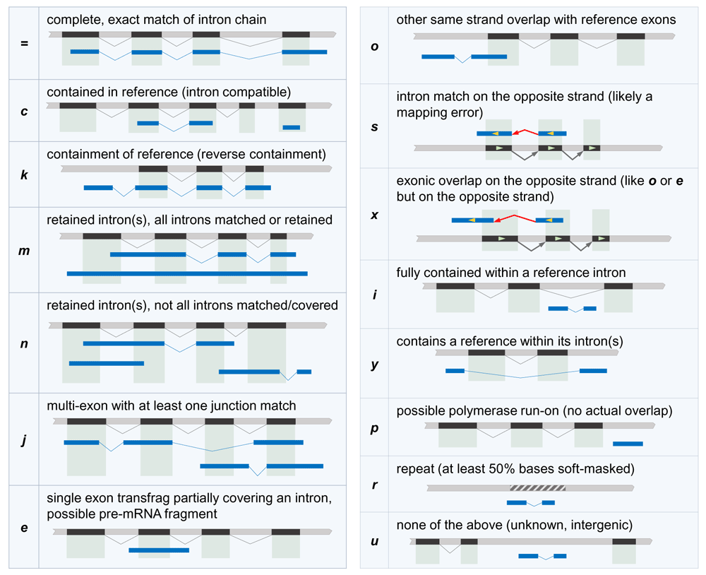Reference exons and transcripts are shown in black, transcripts to be classified are shown in blue, and hashed regions represent repeated regions in the genome. For example, the transcript in blue on the uppermost left panel is labeled “=” because all of its introns precisely match the annotation in black.