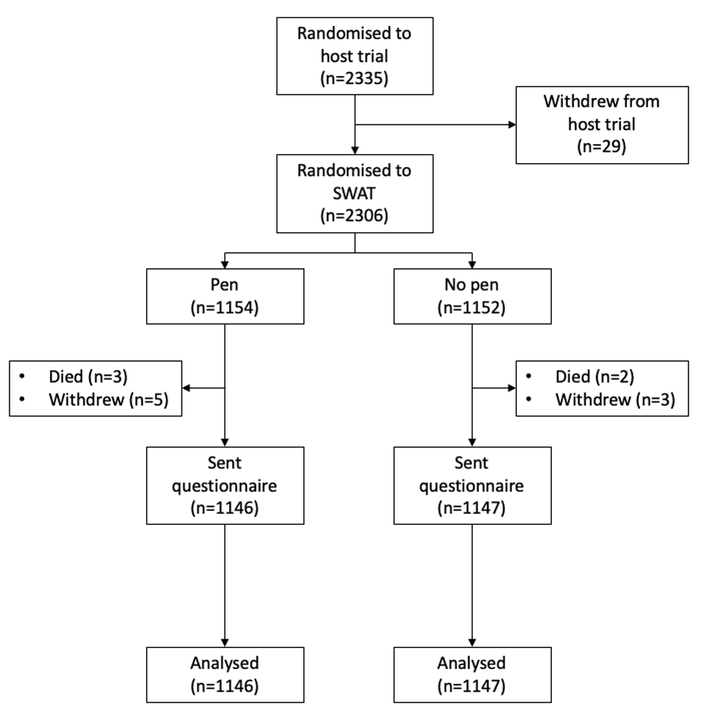 Participants were not informed of their explicit participation in the SWAT, but due to the nature of the intervention could not be blinded to receipt (or not) of a pen with their questionnaire. Similarly, it was not possible to blind research staff to SWAT allocation.