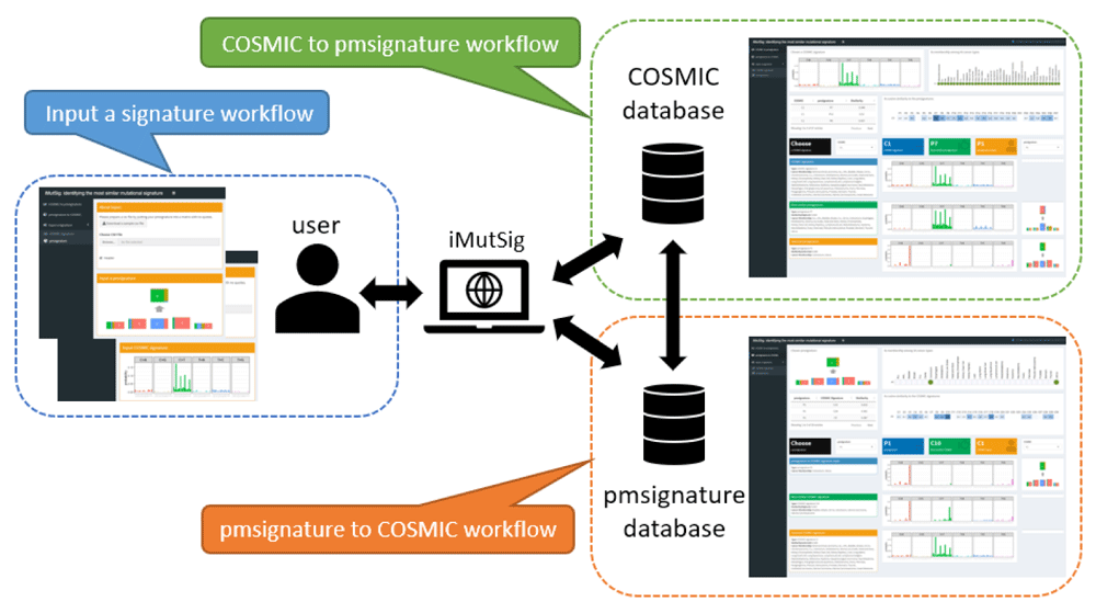 iMutSig is a user-friendly interactive browser-based application that allows users who have a signature that they have discovered in an analysis of their own data to identify the best-matched existing mutational signature from the COSMIC and PM databases. It also allows users to directly compare signatures between the two databases. It does this in an interactive way, and also allows straightforward visualization of results. iMutSig enables researchers to easily identify the most similar mutational signature and to easily access characteristic information from both data sources without additional software installation and programming of their own.