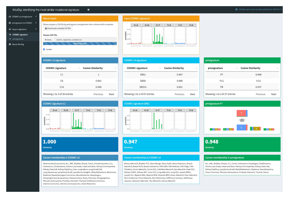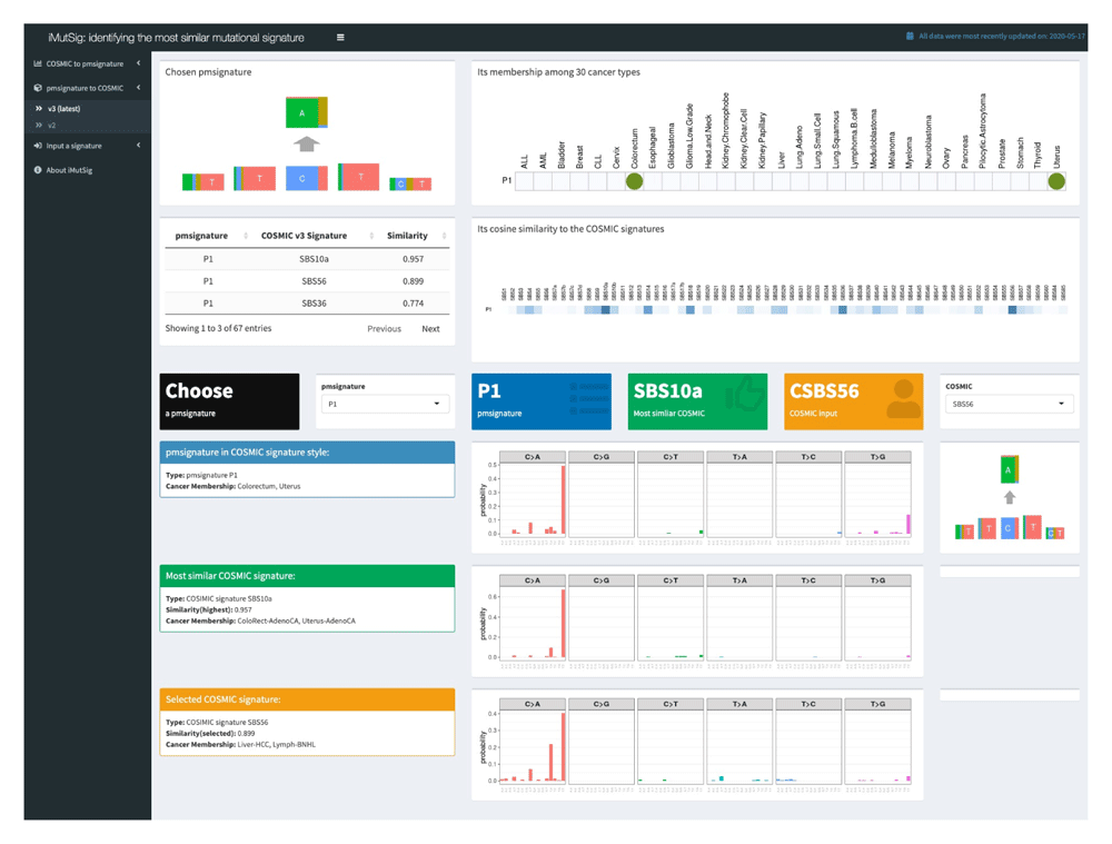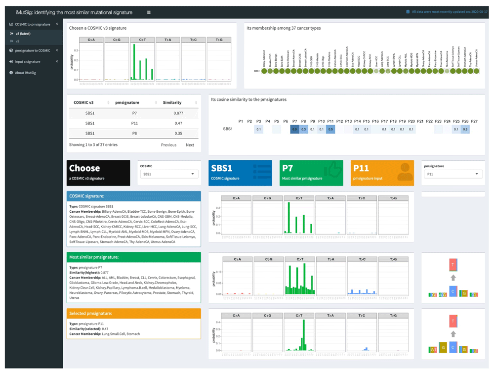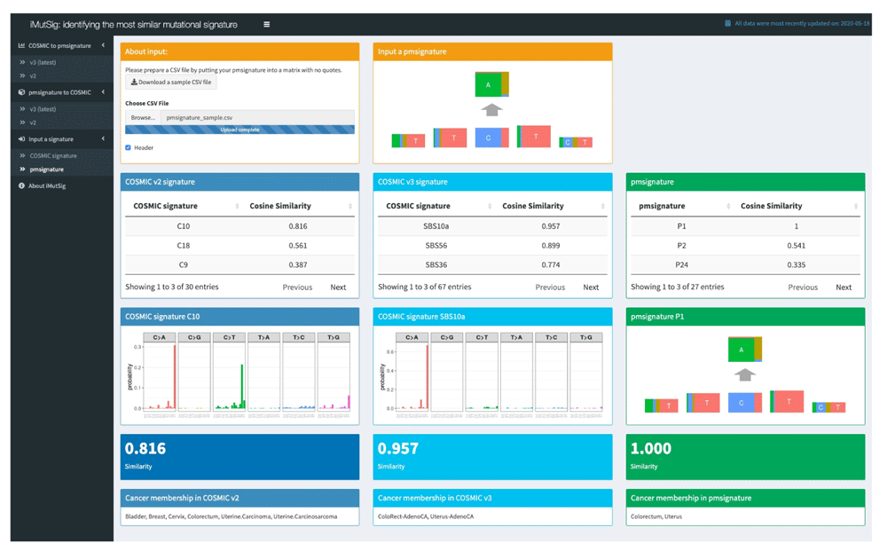 A large number of researchers have published scientific findings resulting from the COSMIC signature-based method10–12, which was defined as the “gold standard" in the field by Baez-Ortega et al.6. Meanwhile, an increasing number of researchers are using the pmsignature-based method for samples with lower numbers of somatic variants due to it requiring fewer parameters9,13,14. Given that both methods are widely used, investigators need the ability to compare results from their analysis with those reported in earlier databases, which may have been produced using the alternate method. For example, researchers have adopted both tools for gastric cancer and tried to compare and integrate the information from two data sources in a somewhat ad hoc manner15. No rigorous tool exists for this task. In this paper we present iMutSig, an easy-to-use tool that allows users to identify the most similar mutational signatures across methods and to compare the information characterizing those signatures using simple point-and-click navigation.