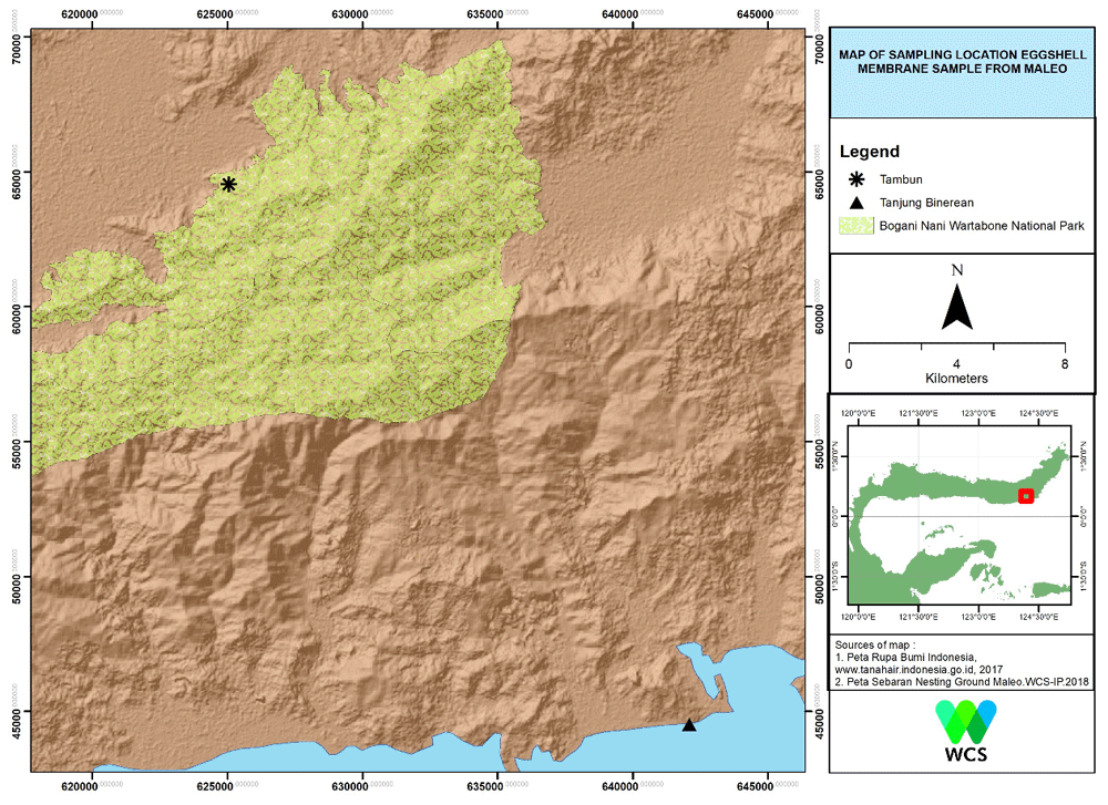 Post-hatched egg-shell membranes were collected from semi-natural hatcheries of Maleo at two different nesting grounds: an inland geothermal heated nesting ground at Tambun (Bogani Nani Wartabone National Parks and a sun-heated sand beach nesting ground at Tanjung Binerean, North Sulawesi, Indonesia (Figure 1). All samples were collected from 4th April until 1st May 2018. Samples were egg-shell membranes from maleo chicks that hatched less than 24 hours earlier based on records of staff from semi-natural hatcheries. The samples were collected from the surface and inside the substrate (soil and sand) where the eggs are laid. To prevent post-sampling contamination, each sample was placed separately in a zip-lock plastic bag and stored in silica gel for delivery to laboratory. The samples were stored at -40°C until DNA extraction were conducted.