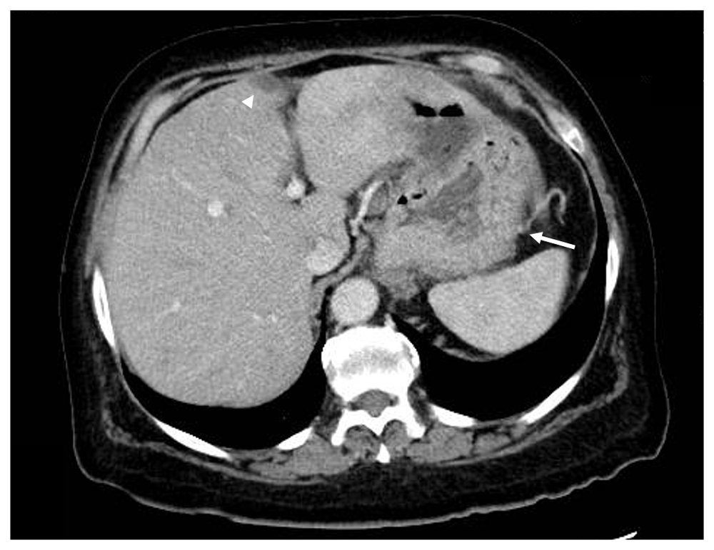 Nonspecific gastric fold thickening in the fundus is observed (arrow). An incidental finding in the liver was noted by a small focal hypoattenuation in the middle segment of the left lobe of the liver adjacent to the fissure for ligamentum teres (arrowhead). This nodule was confirmed as PET-negative on later PET/CT studies.