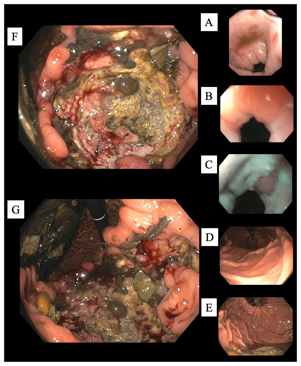 (From proximal to distal.) (A) Esophagitis. (B) Gastro-esophageal junction. (C) More esophagitis, and a tongue of columnar mucosa. (D) Normal gastric cardia. (E) Normal gastric fundus. (F) Cavernous ulcer along the incisura (lesser curvature) with debris, food particles, and some central exudates (G) Continued ulcer description. At the 12 o'clock position the scope is originating from the gastric cardia and fundus region. At 3 o'clock is the expected location of the pylorus. However, due to size and extent of the ulcer typical anatomy and landmarks were considerably distorted making visualization of the fundus from that particular EGD position not possible. At 6 o'clock the ulcer is shown to extend along the incisura. At 9 o'clock food debris is seen along the greater curvature.