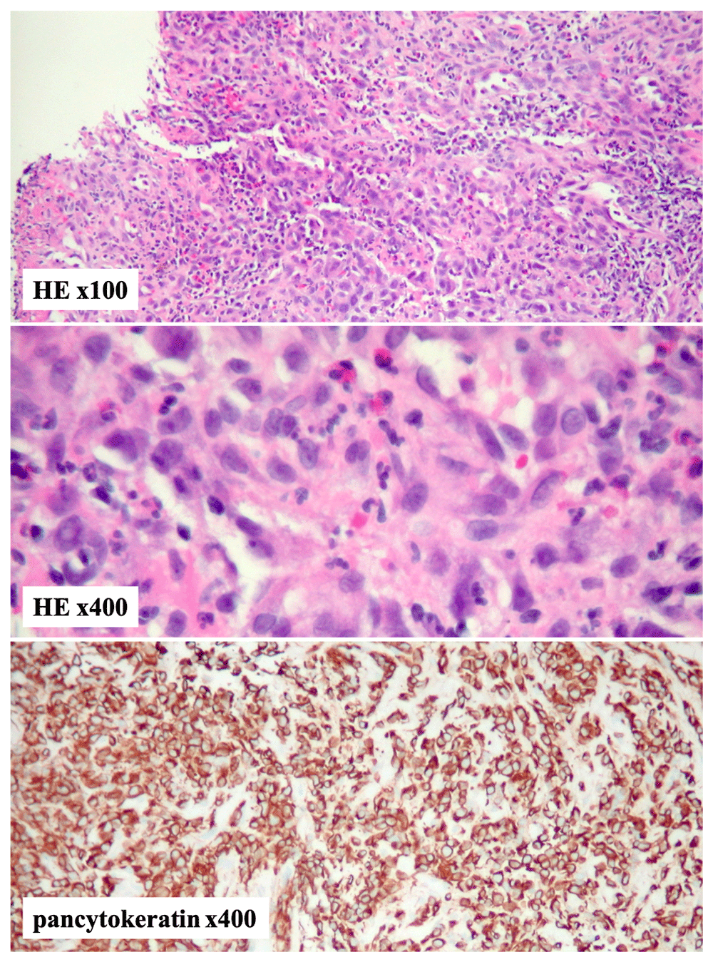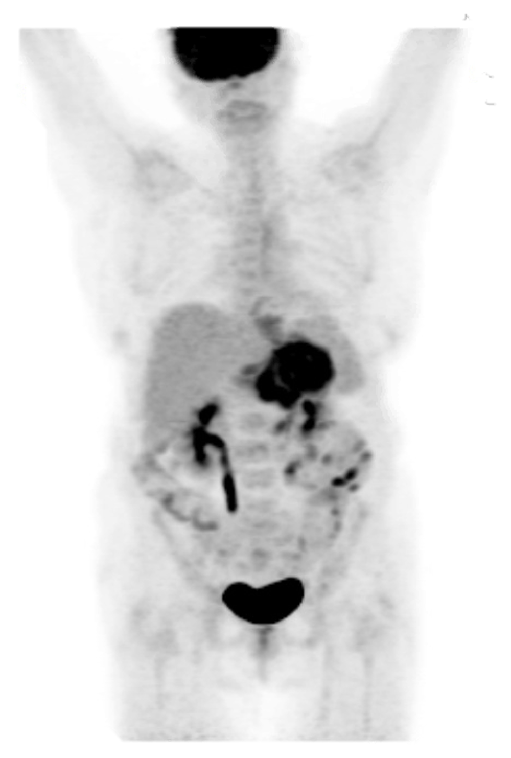 Microscopically, antral mucosa demonstrated mild chronic gastritis. Histopathology revealed a diffuse-type, invasive poorly differentiated adenocarcinoma. IHC staining was only positive for pancytokeratin. The malignant-appearing cells lacked immunoreactivity for synaptophysin, CD45, and HER2 (Figure 3). Together with histopathology and this IHC profile gastric adenocarcinoma was confirmed. She underwent a positron emission tomography (PET) scan for staging. The PET scan showed a localized but advanced gastric neoplasm not associated with any regional PET-avid lymphadenopathy. No obvious metastatic disease was present (Figure 4). Thus, she was diagnosed with locally advanced Stage IB gastric adenocarcinoma (Figure 5).
