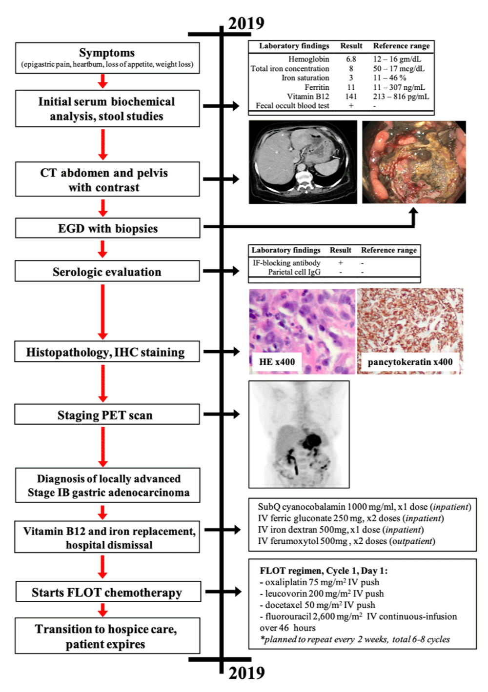 She was started on intravenous vitamin B12 and iron replacement (dose given in Figure 5). Her remaining symptoms improved slowly while she observed in post-operative period with twice-daily oral 40 mg pantoprazole and daily polyethylene glycol. She continued to improve following intravenous vitamin B12 and iron replacement and transitioned to a scheduled oral cyanocobalamin 1000 µg daily regimen. Oral iron supplementation was discouraged due to the propensity of oral iron medication to be significantly irritative to the gastric mucosal lining. She was dismissed from the hospital and established care with a local oncologist. Due to the nature of her disease, chemotherapy was recommended. The patient initiated treatment with the FLOT regimen (oxaliplatin, leucovorin, docetaxel, fluorouracil) for her advanced, invasive poorly differentiated gastric adenocarcinoma (Figure 5). However, the patient did not tolerate chemotherapy well and only was able to endure one cycle. She wished to stop all therapies and was transitioned to hospice care. Two weeks after stopping chemotherapy, the patient expired.