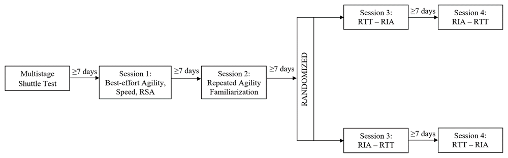 The current study was a randomised, counter-balanced study conducted across five sessions from June, 2018 to August, 2018 (Figure 1). During the first session, the participants completed a Multistage Shuttle test to determine predicted maximal aerobic capacity (VO2max)10. The second session was utilised to obtain baseline assessments of speed (30-metre sprint), agility (Illinois Agility test, Agility T-Test) and repeat-sprint ability (RSA). The third session familiarised participants with the RTT and RIA tests. During the fourth and fifth sessions, participants undertook both the RIA and RTT, in randomised order, with at least 15-minutes of recovery between each protocol.